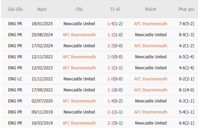 Thành tích đối đầu quá khứ giữa AFC Bournemouth vs Newcastle United