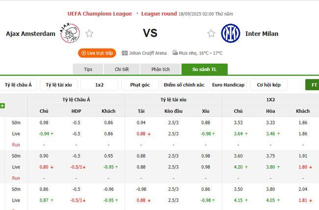 Tỷ kệ kèo Ajax Amsterdam vs Inter Milan
