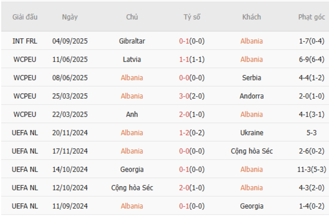 Với thành tích thắng 2, hòa 2, thua 1 trong 5 trận gần nhất, Albania đang có phong độ ổn định hơn hẳn. Sức mạnh của họ đến từ hàng công đã ghi được 5 bàn thắng và hàng thủ chỉ để lọt lưới 3 bàn.
