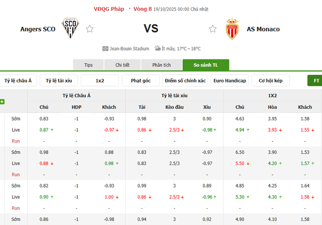 Tỷ kệ kèo Angers vs AS Monaco