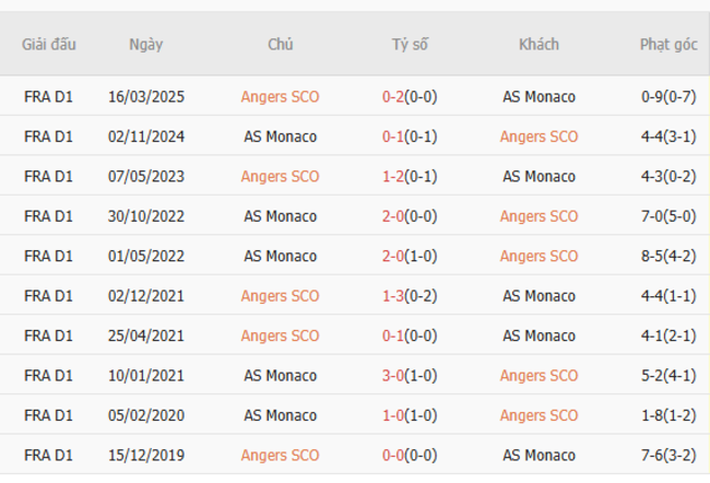 Thành tích đối đầu quá khứ giữa Angers vs AS Monaco