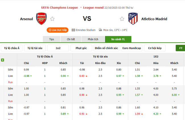 Tỷ kệ kèo Arsenal vs Atletico Madrid