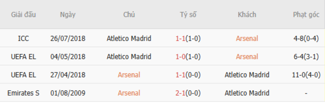 Thành tích đối đầu quá khứ giữa Arsenal vs Atletico Madrid