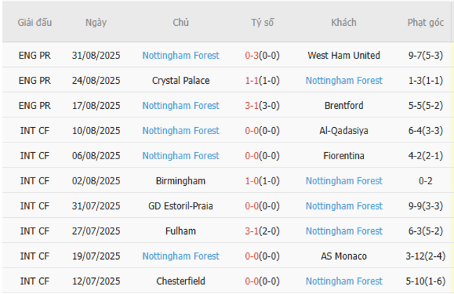 Phong độ của Nottingham Forest
