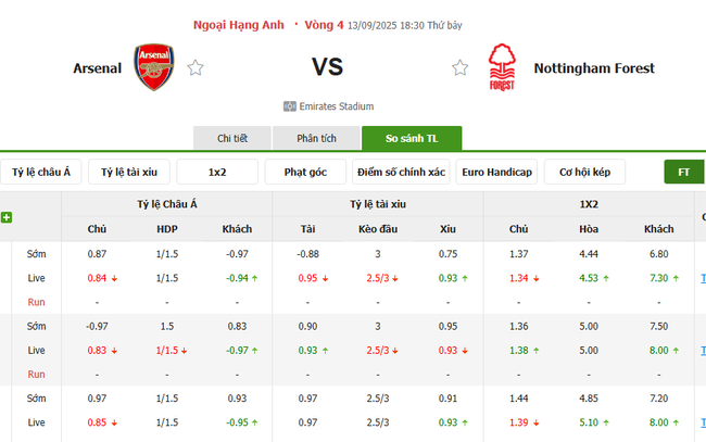 Tỷ kệ kèo Arsenal vs Nottingham Forest