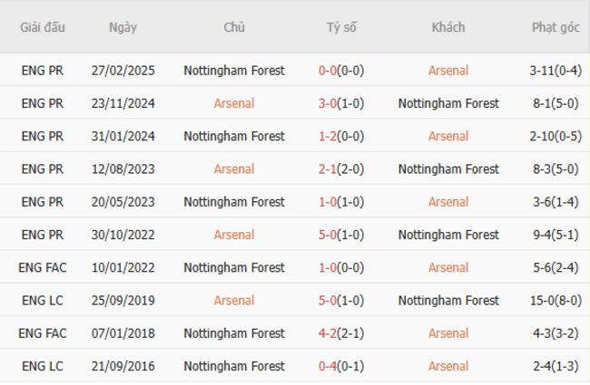 Thành tích đối đầ u quá khứ giữa Arsenal vs Nottingham Forest