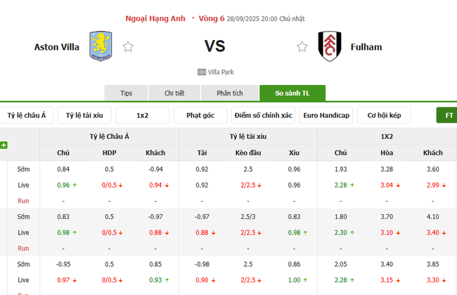 Tỷ kệ kèo Aston Villa vs Fulham