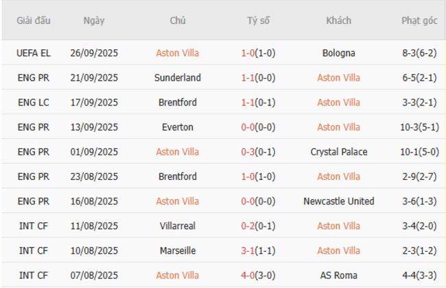 Phong độ của Aston Villa