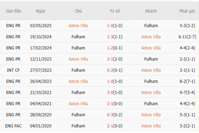 Thành tích đối đầu quá khứ giữa Aston Villa vs Fulham