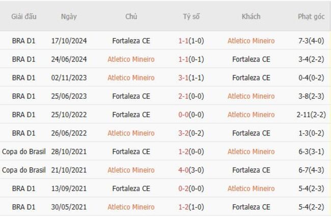 Thành tích đối đầu quá khứ giữa Atletico Mineiro vs Fortaleza