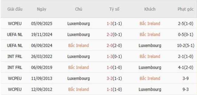 Thành tích đối đầu quá khứ giữa Bắc Ireland vs Luxembourg