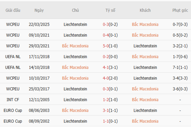 Thành tích đối đầu quá khứ giữa Bắc Macedonia vs Liechtenstein
