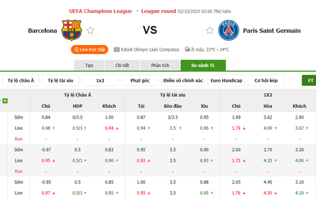 Tỷ lệ kèo Barcelona vs Paris Saint Germain