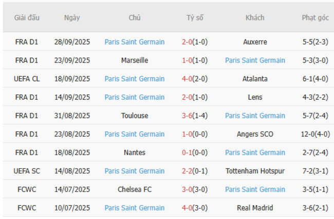 Paris Saint-Germain cũng duy trì khả năng ghi bàn đáng gờm, với 14 pha lập công trong 5 trận gần nhất (4 thắng, 1 thua).