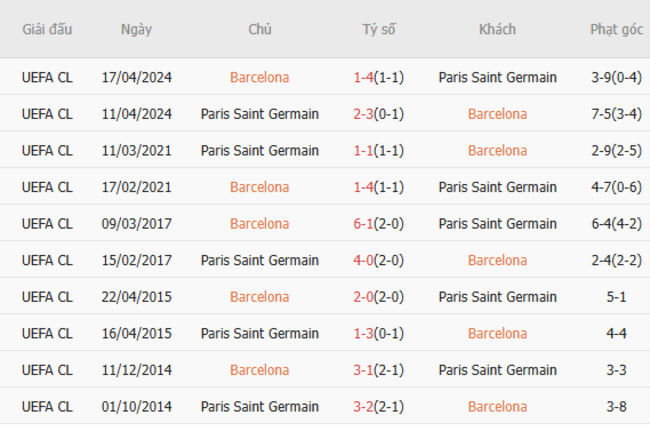 Thành tích đối đầu quá khứ giữa Barcelona vs Paris Saint Germain