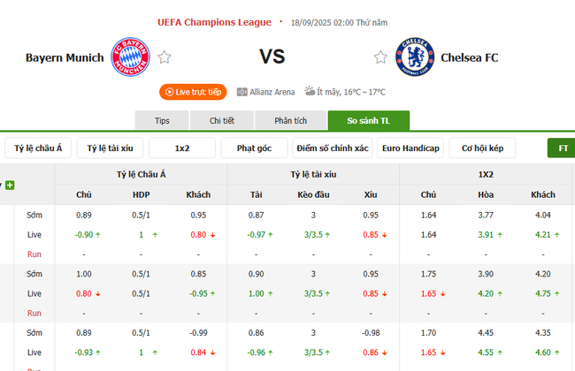 Tỷ kệ kèo Bayern Munich vs Chelsea FC