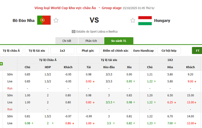 Tỷ kệ kèo Bồ Đào Nha vs Hungary