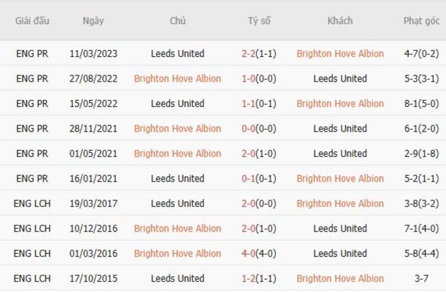 Thành tích đối đầu quá khứ giữa Brighton vs Leeds United