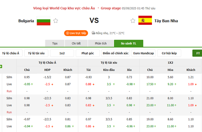 Tỷ kệ kèo Bulgaria vs Tây Ban Nha