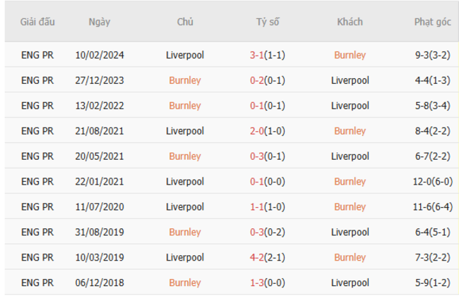 Thành tích đối đầu quá khứ giữa Burnley vs Liverpool