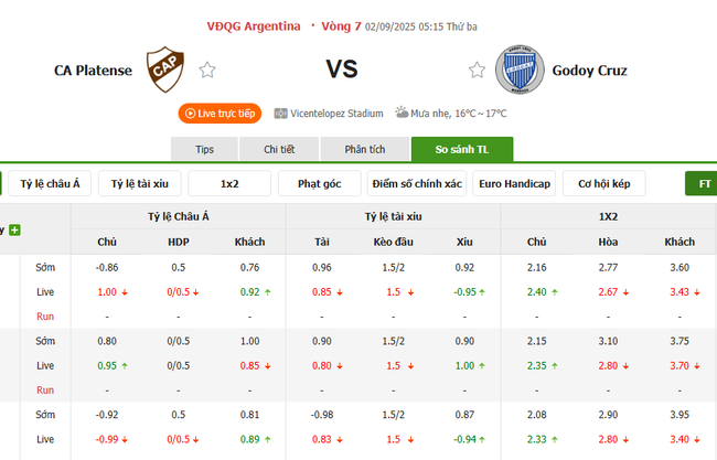 Tỷ kệ kèo CA Platense vs Godoy Cruz