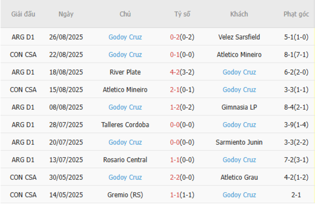Trong khi đó, con số thống kê của Godoy Cruz giống như một cơn ác mộng, thua cả 5 trận và thủng lưới trung bình hơn 2 bàn mỗi trận. Rõ ràng, Godoy Cruz đang đứng trước một bài toán cực khó.