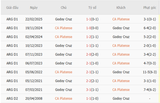 Lịch sử đối đầu giữa Platense và Godoy Cruz luôn diễn ra hết sức cân bằng. Lần gần nhất hai đội gặp nhau, Platense đã cầm hòa Godoy Cruz ngay trên sân khách với tỷ số 1-1. Nếu nhìn xa hơn, trong 5 lần đụng độ gần nhất, cán cân không nghiêng về bên nào: Platense giành 2 chiến thắng, Godoy Cruz có 1, và hai trận còn lại kết thúc với tỷ số hòa.
