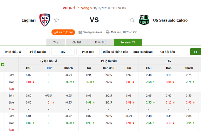 Nhận định soi kèo Cagliari vs US Sassuolo Calcio, 0h30 ngày 31/10/2025