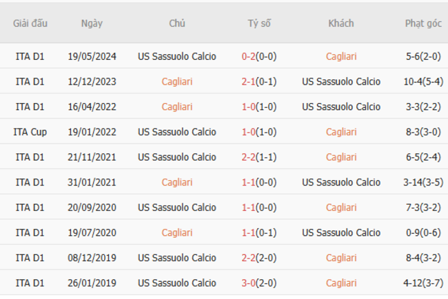 Thành tích đối đầu quá khứ giữa Cagliari vs US Sassuolo Calcio