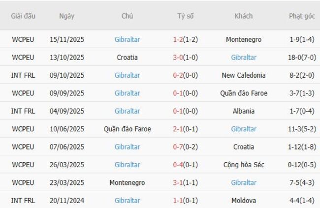Câu chuyện của Gibraltar lại hoàn toàn trái ngược khi họ đứng cuối Bảng L với 0 điểm sau 7 trận đấu và đã bị loại khỏi cuộc đua giành vé dự World Cup. Đây là một chiến dịch thảm họa: ghi được ba bàn thắng, thủng lưới 22 lần, không thắng, không hòa và không có hy vọng xoay chuyển tình thế ở giai đoạn này.
