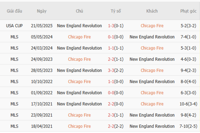 Thành tích đối đầu quá khứ giữa Chicago Fire vs New England Revolution