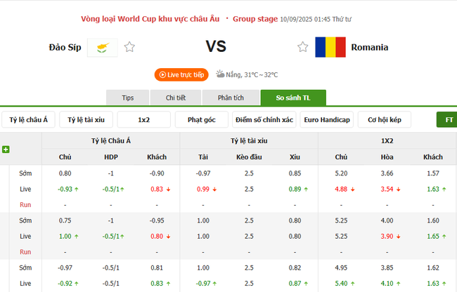 Phán đoán tỷ số - Đảo Síp vs Romania