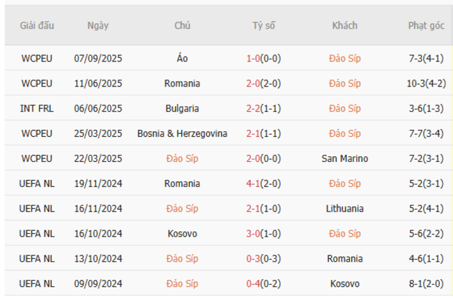 5 trận gần nhất, Đảo Síp có phong độ kém hơn với chỉ 1 chiến thắng, 1 trận hòa và 3 trận thua. Hàng công của Đảo Síp ghi được 5 bàn nhưng hàng thủ lại để lọt lưới 7 bàn.