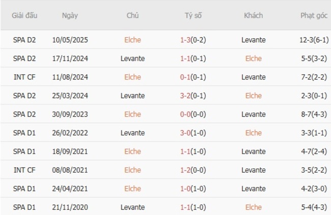 Thành tích đối đầu quá khứ giữa Elche vs Levante