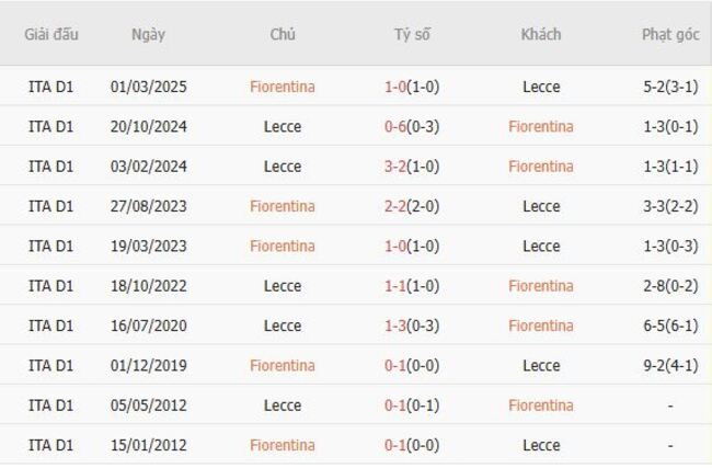 Thành tích đối đầu quá khứ giữa Fiorentina vs Lecce
