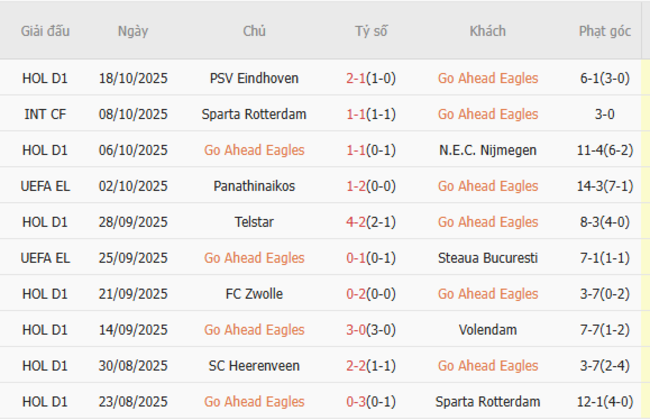 Go Ahead Eagles đã bị đánh bại trong trận đấu gần nhất, và trận đấu này diễn ra trên sân khách tại Philips Stadion. PSV Eindhoven đã giành chiến thắng 2-1 tại Eredivisie. Đội Deventer đã có hai cú sút trúng đích và kiểm soát bóng 43%, trong đó Milan Smit là người ghi bàn.