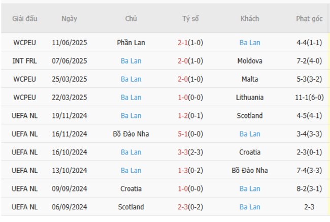Phía đối diện Ba Lan có phong độ kém ổn định hơn với 3 chiến thắng nhưng cũng để thua 2 trận. Hàng công của đội ghi được 7 bàn và thủng lưới 4 lần, cho thấy hiệu suất tấn công và phòng ngự thấp hơn so với đối thủ sắp tới.