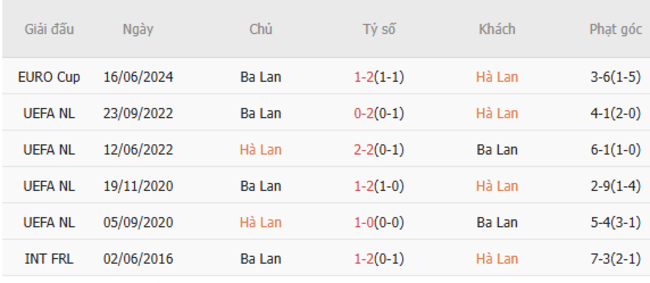 Trong 20 lần gặp gỡ, Ba Lan chỉ giành được 3 chiến thắng, trong khi Hà Lan đã thắng 10 và hòa 7. Đặc biệt, Đại bàng trắng đã không thể đánh bại Cơn lốc da cam kể từ năm 1979. Lần chạm trán gần nhất tại EURO 2024, Hà Lan cũng giành chiến thắng 2-1. Với những thống kê này thì đánh giá cao khả năng ca khúc khải hoàn của thầy trò HLV Ronald Koeman.