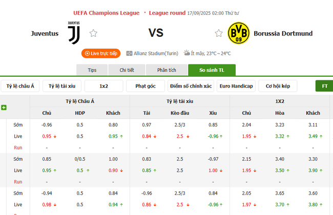 Tỷ lệ kèo Juventus vs Borussia Dortmund