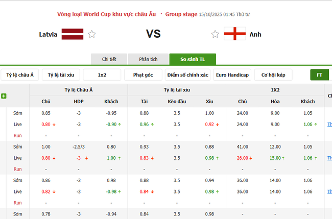 Tỷ kệ kèo Latvia vs Anh