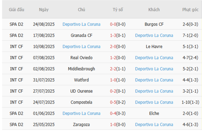 Trái lại Deportivo La Coruna đang có một khởi đầu khá ấn tượng. Sau nhiều năm ngụp lặn ở giải hạng ba, họ đã trở lại Segunda Division. Chiến thắng 3-1 trước Granada ngay trận mở màn là một lời khẳng định đanh thép cho tham vọng của Branquiazuis. Mặc dù bị cầm hòa 0-0 ở trận đấu gần nhất, nhưng 4 điểm sau hai trận là một thành tích tốt.