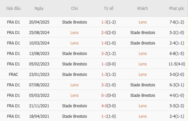 Thành tích đối đầu quá khứ giữa Lens vs Stade Brestois