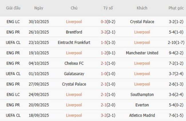 Đã 72 năm kể từ lần gần nhất cùng Liverpool thua năm trận liên tiếp ở giải đấu hàng đầu - phải chịu số phận không mong muốn đó vào năm 1953. Trong số sáu trận thua đáng tiếc của Lữ đoàn đỏ trong bảy trận gần đây, chỉ có một trận xảy ra trên sân nhà tại Premier League, nhưng Liverpool vẫn đang phải chịu đựng chuỗi trận tệ hại nhất tại giải đấu hàng đầu này - trong khi đó, đội khách lại hoàn toàn ngược lại.