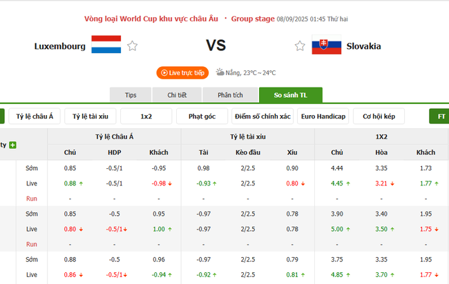 Tỷ lệ kèo Luxembourg vs Slovakia