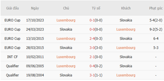 Thành tích đối đầu quá khứ giữa Luxembourg vs Slovakia