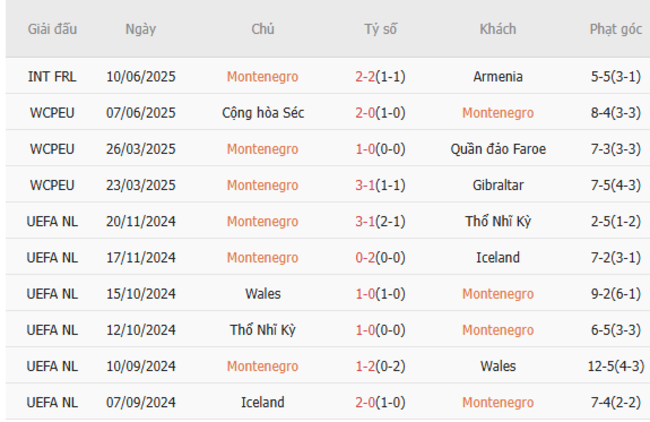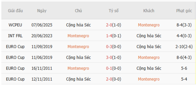 Thành tích đối đầu quá khứ giữa Montenegro vs Cộng hòa Séc
