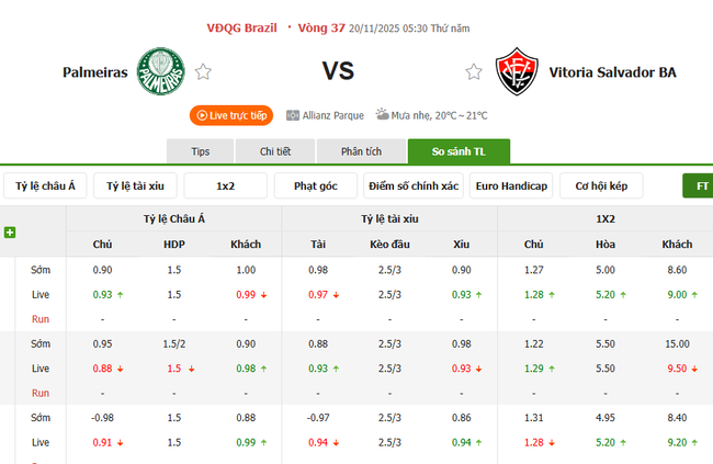 Trên đây là những nhận định và soi kèo bóng đá chuyên sâu cho màn thư hùng giữa Palmeiras vs Vitoria Salvador diễn ra vào lúc 05h30 ngày 20/11/2025.