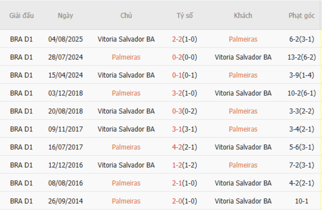 Thành tích đối đầu quá khứ giữa Palmeiras vs Vitoria Salvador