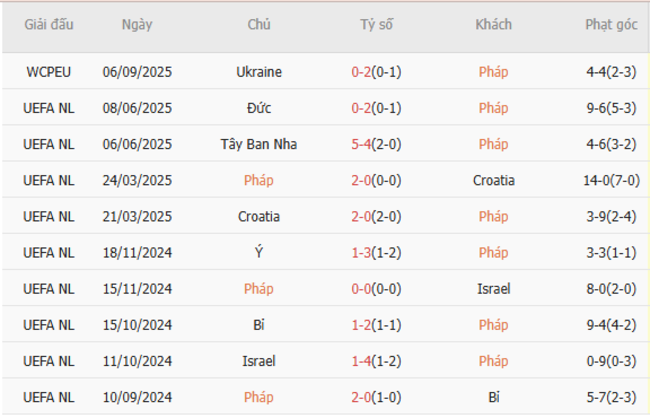 Hrong 5 trận đấu gần nhất, đội tuyển Pháp đã giành 3 chiến thắng và chịu 2 thất bại. Hàng công của Les Bleus chơi khá hiệu quả với 10 bàn thắng, nhưng hàng thủ vẫn có những lỗ hổng khi để lọt lưới 7 lần.