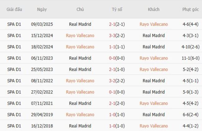 Thành tích đối đầu quá khứ giữa Rayo Vallecano vs Real Madrid